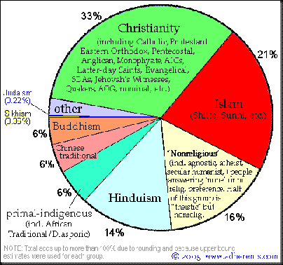 Here is another very interesting outlook into reality. Religion has always been an extensive debate in the world, but what most people do not take the time to realize is that the only reason there is even an argument is because so many people in this world lives with a contradictory reality compared to others. Observe the graph below and you will witness how many major religions subsist in the world and how many followers each consist of.